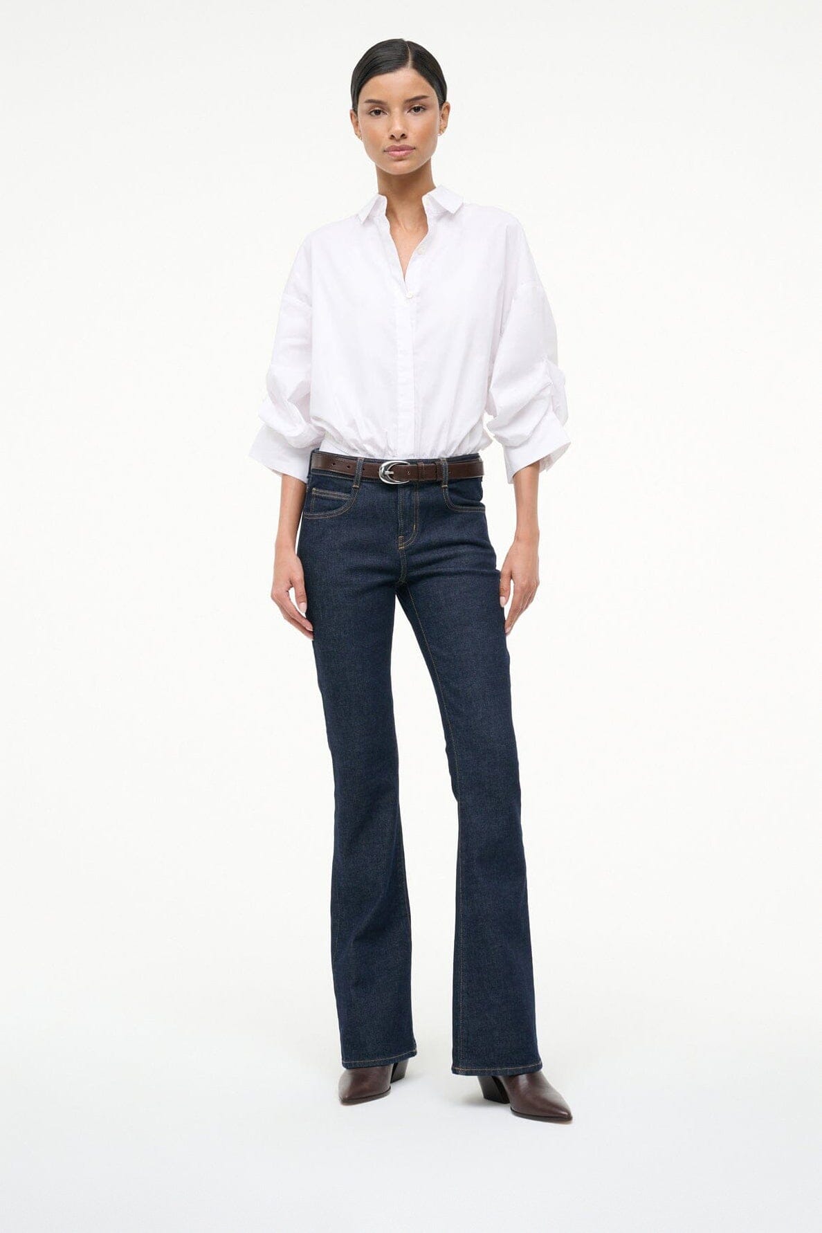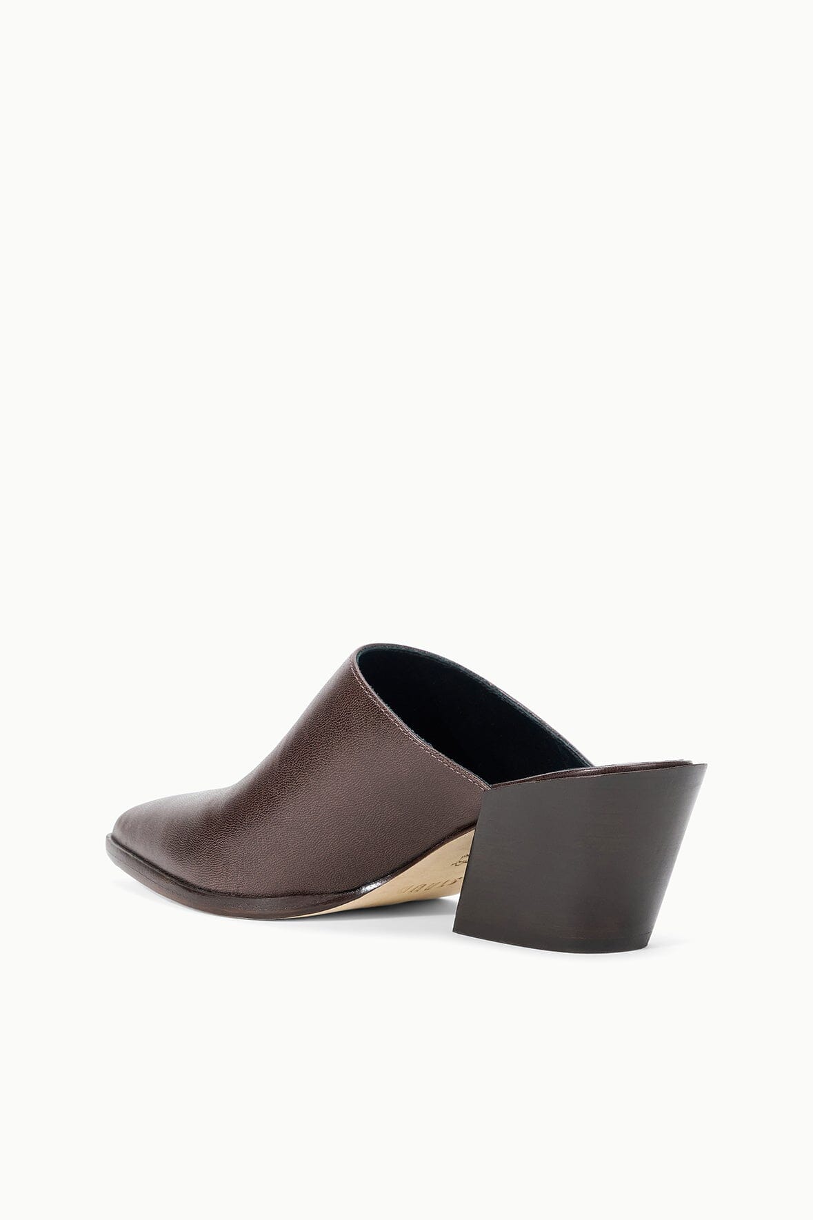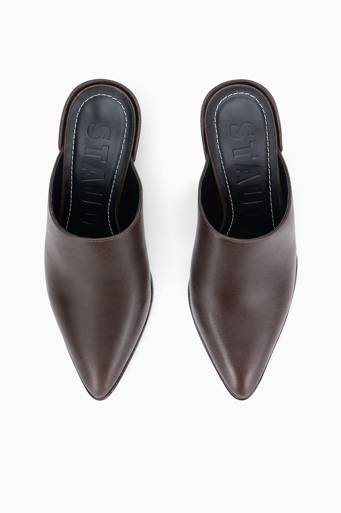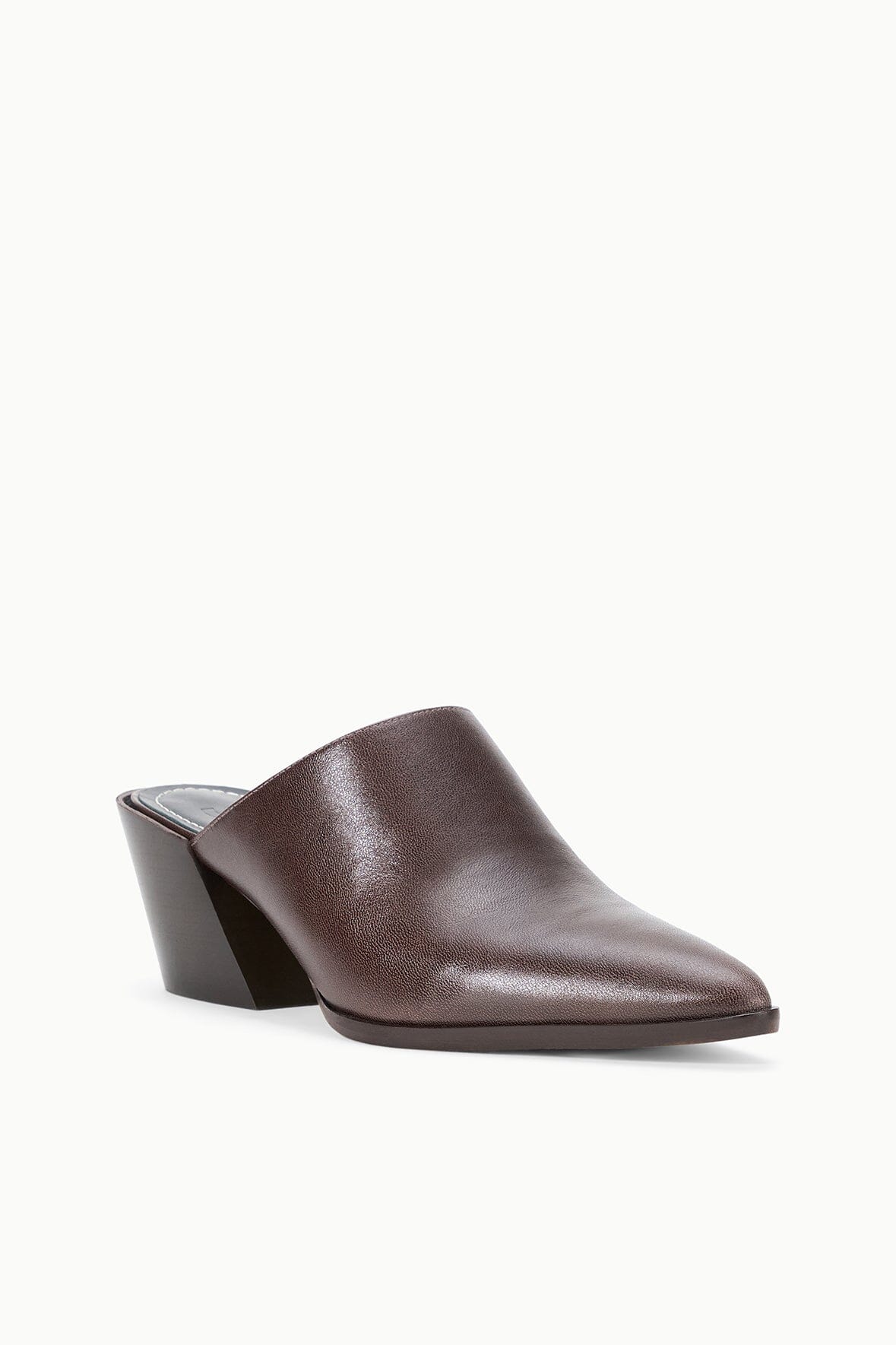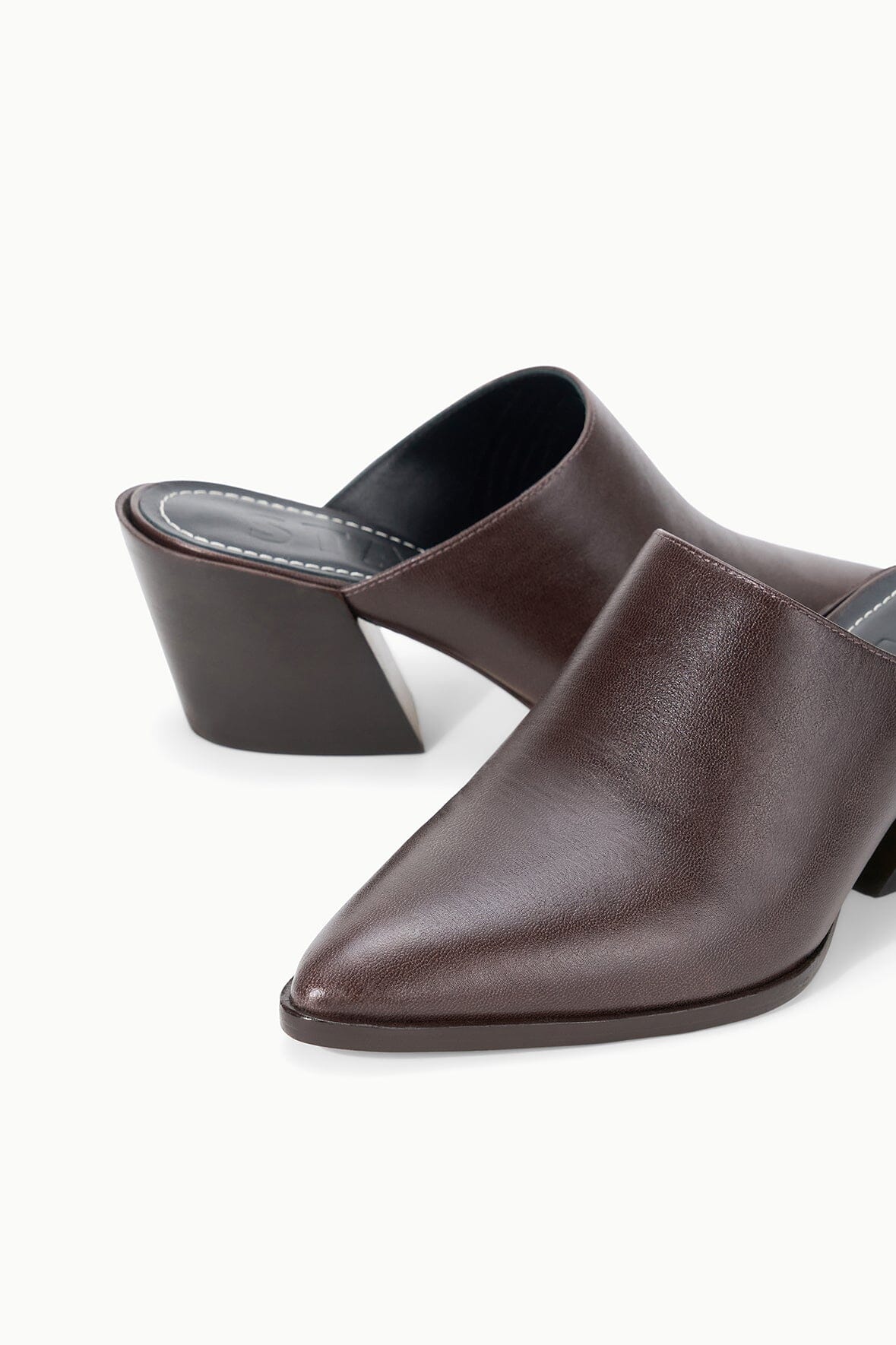 The Austen Mule is a western-inspired slip-on mule, featuring a chunky block heel and a pointed toe.