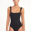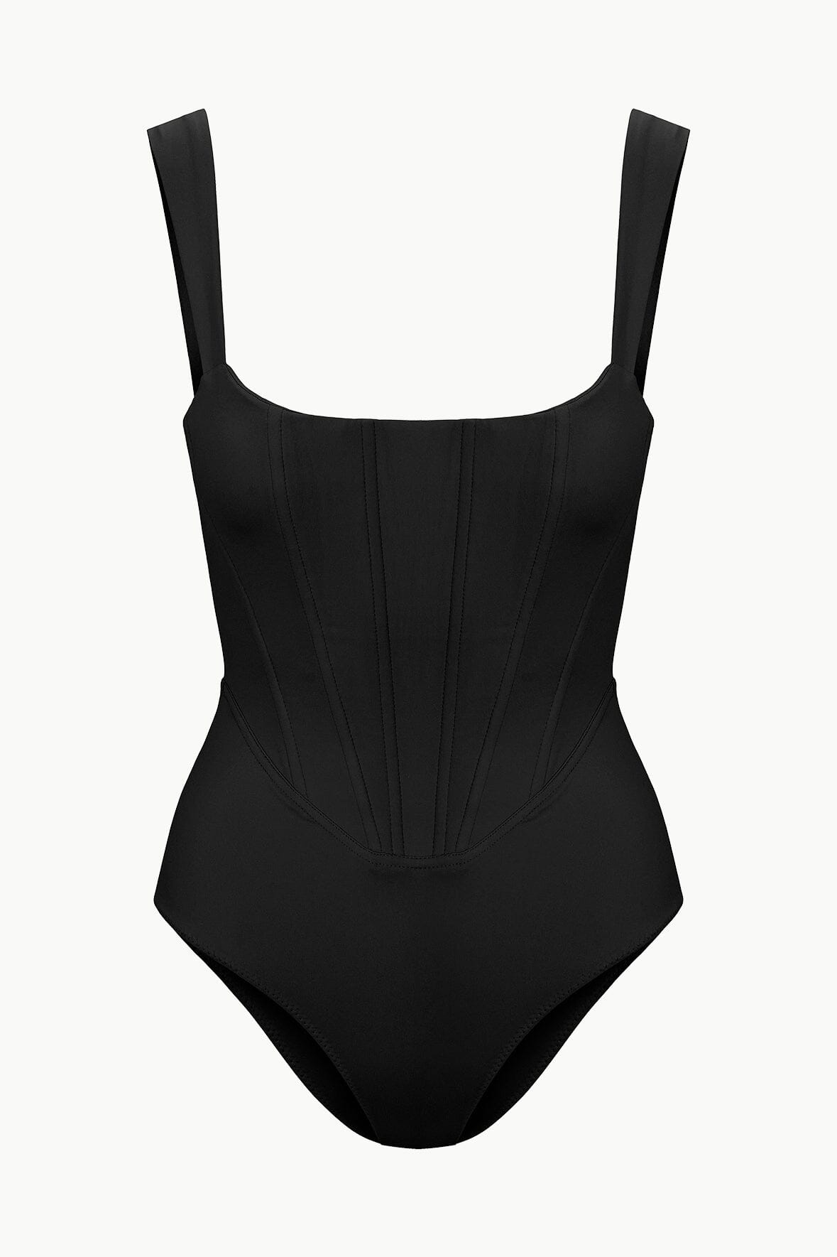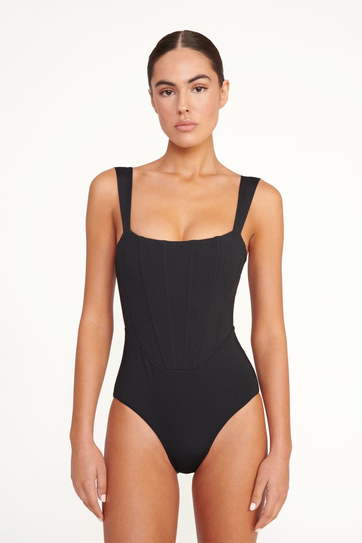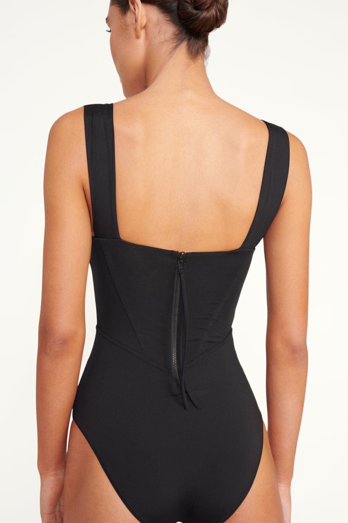The Adelaide is a new one piece swimsuit with corset-style boning throughout the chest and torso. This style features zipper at the back and supportive shoulder straps.