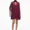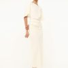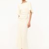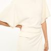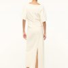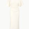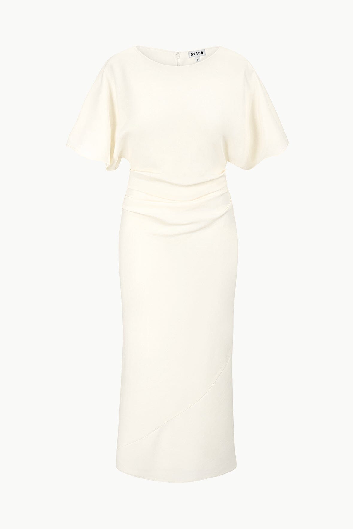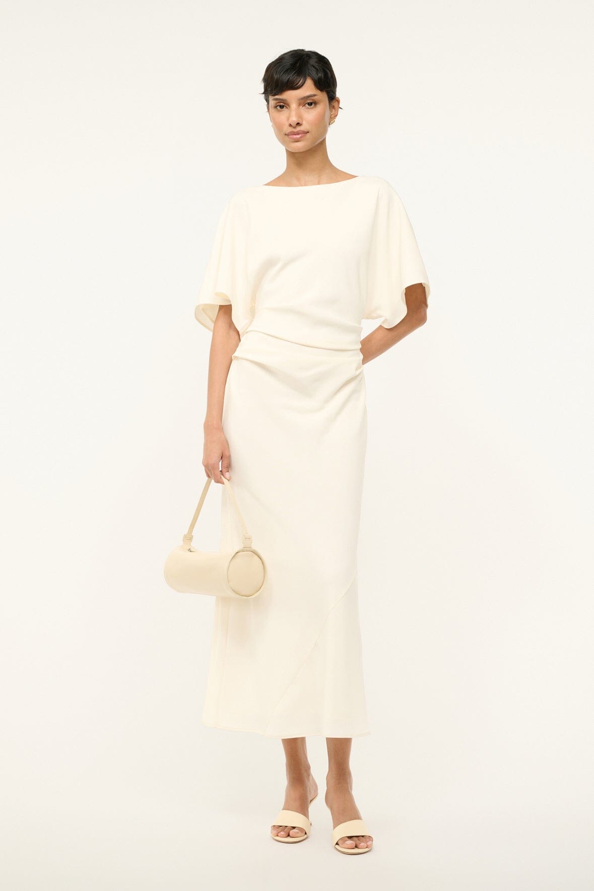The Amelie is a midi length dress with a boat neckline and dolman sleeves. It features a center back slit and ruching at the waist creates a gentle drape.