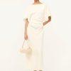 The Amelie is a midi length dress with a boat neckline and dolman sleeves. It features a center back slit and ruching at the waist creates a gentle drape.