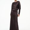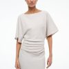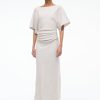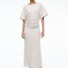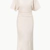 The Amelie is a midi length dress with a boat neckline and dolman sleeves. It features a center back slit and ruching at the waist creates a gentle drape.
