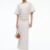 The Amelie is a midi length dress with a boat neckline and dolman sleeves. It features a center back slit and ruching at the waist creates a gentle drape.