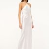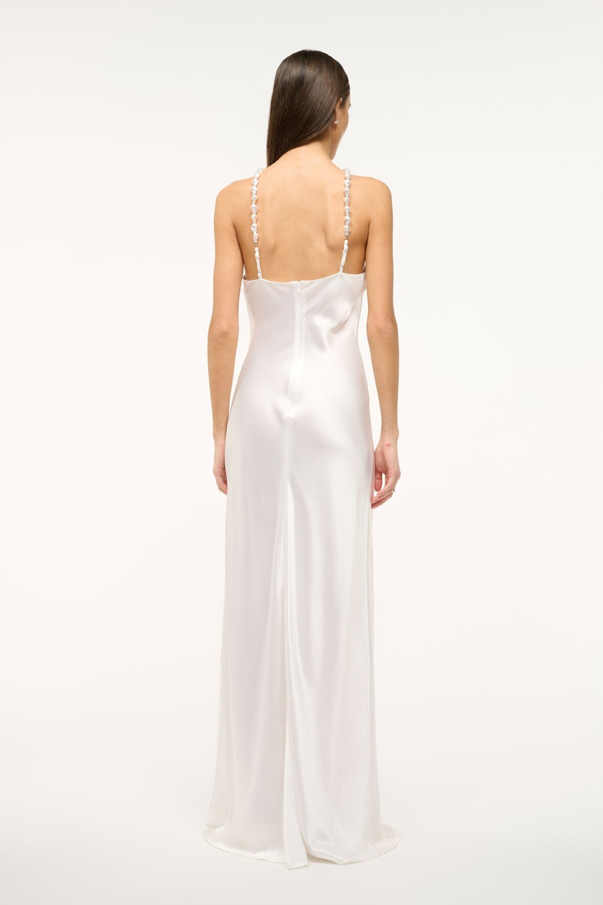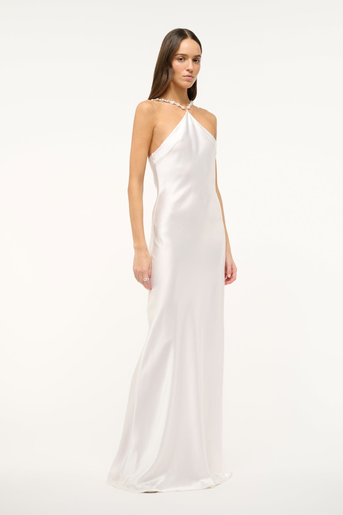 The Cadence is a floor length slip dress featuring a halter neckline with beaded straps. This dress is crafted in satin and has a hidden back zipper.