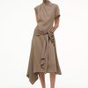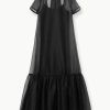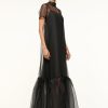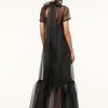 The Calluna Dress is a high neck organza gown with scoop back and functional neck tie. This style features a tiered ruffle hem and a midi slip.