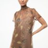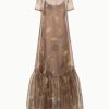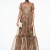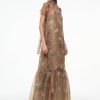 The Calluna Dress is a high neck organza gown with scoop back and functional neck tie. This style features a tiered skirt ruffle hem. Updated in a stretchy removable slip for added comfort and ease of use.