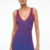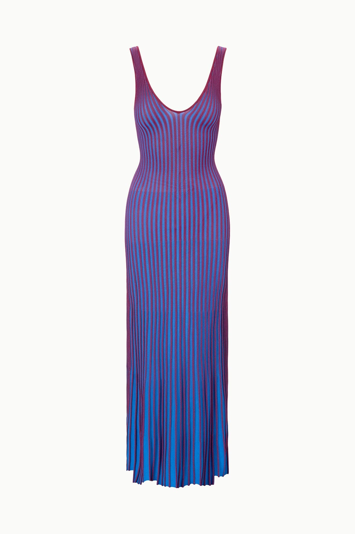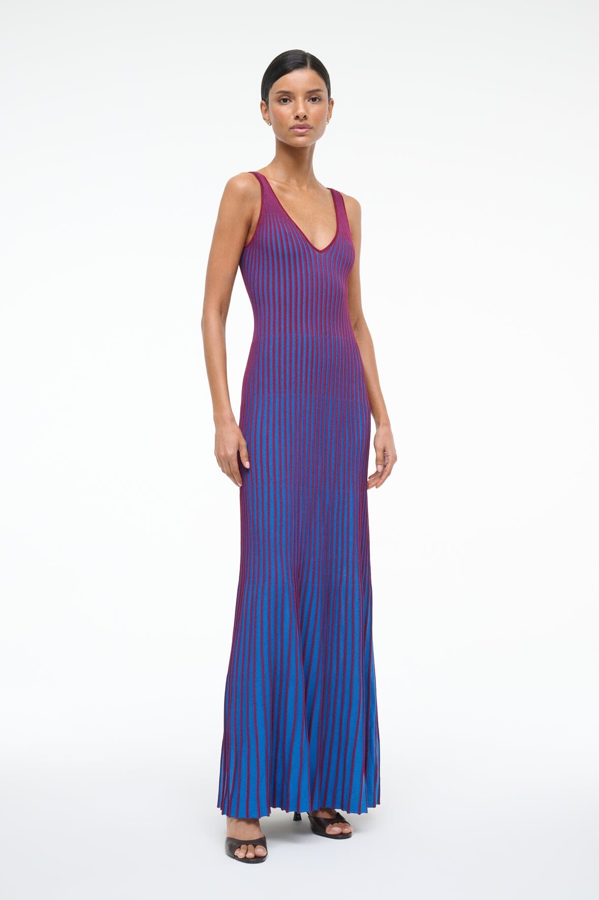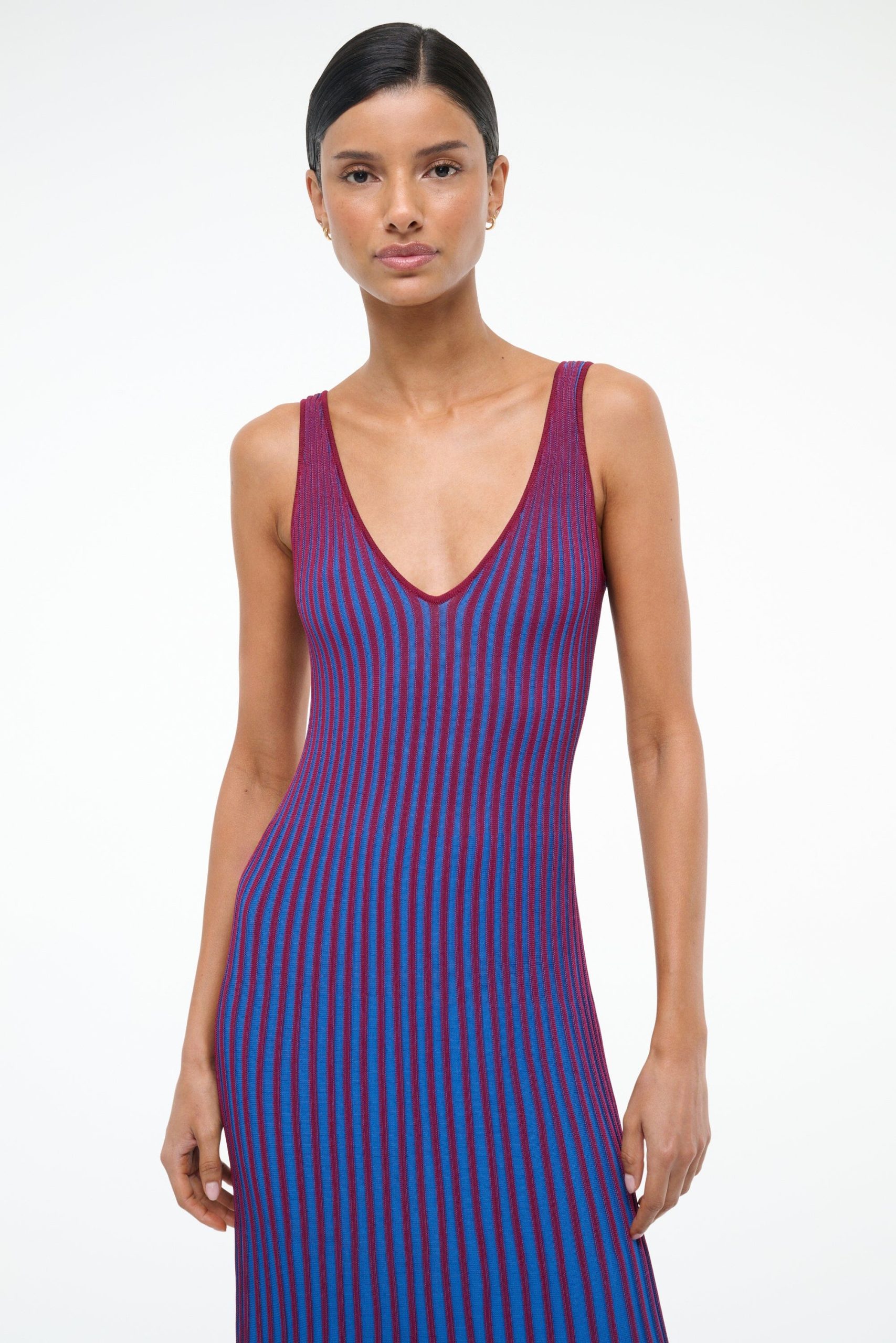 A sleeveless, maxi length dress made out of a flattering two-toned pleated rib knit fabric. This slip-on dress features a deep v neckline and slightly fluted skirt.