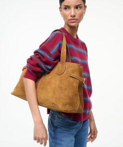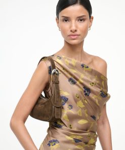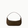 The Demy Shoulder Bag is a chic convertible bag that can be worn over the shoulder or hand held. It features signature hardware clasp on the strap to convert the shape to a handheld pouch. This style features a suede body, a top zipper, and signature hardware.