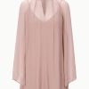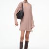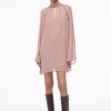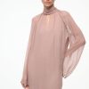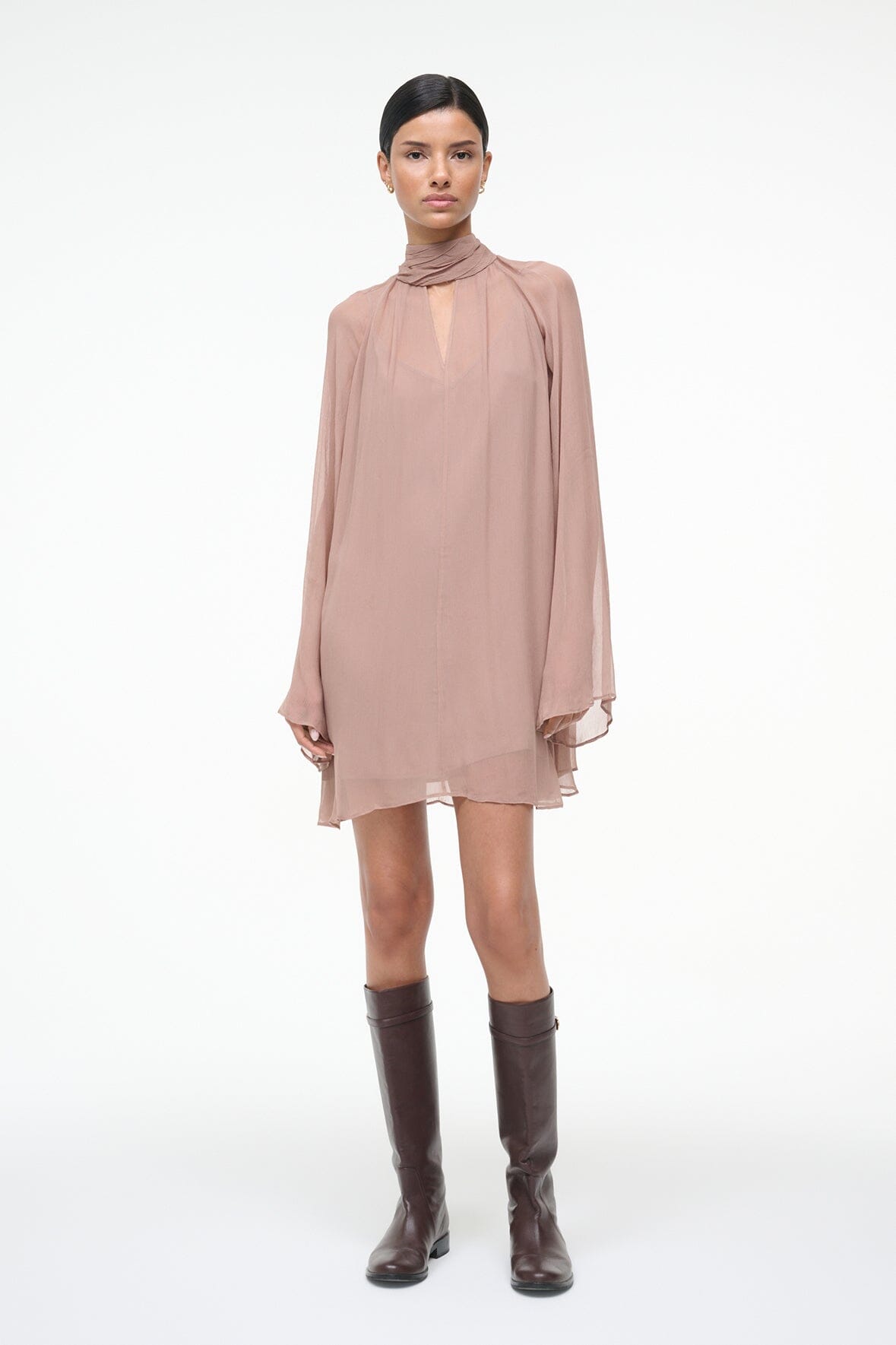 The Esther Mini Dress is a long sleeve flowy mini dress featuring a sheer chiffon overlay, a keyhole cutout, and a scarf neck tie feature.