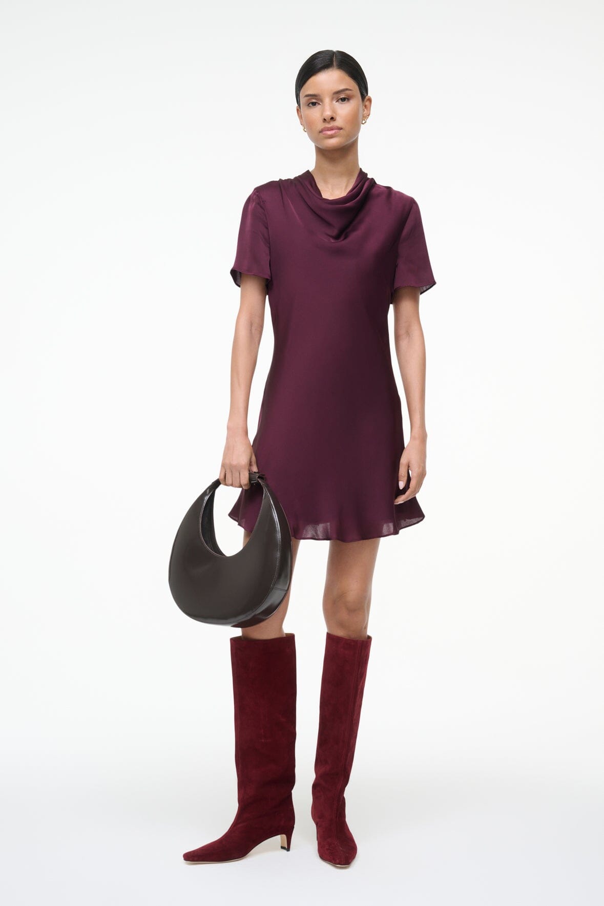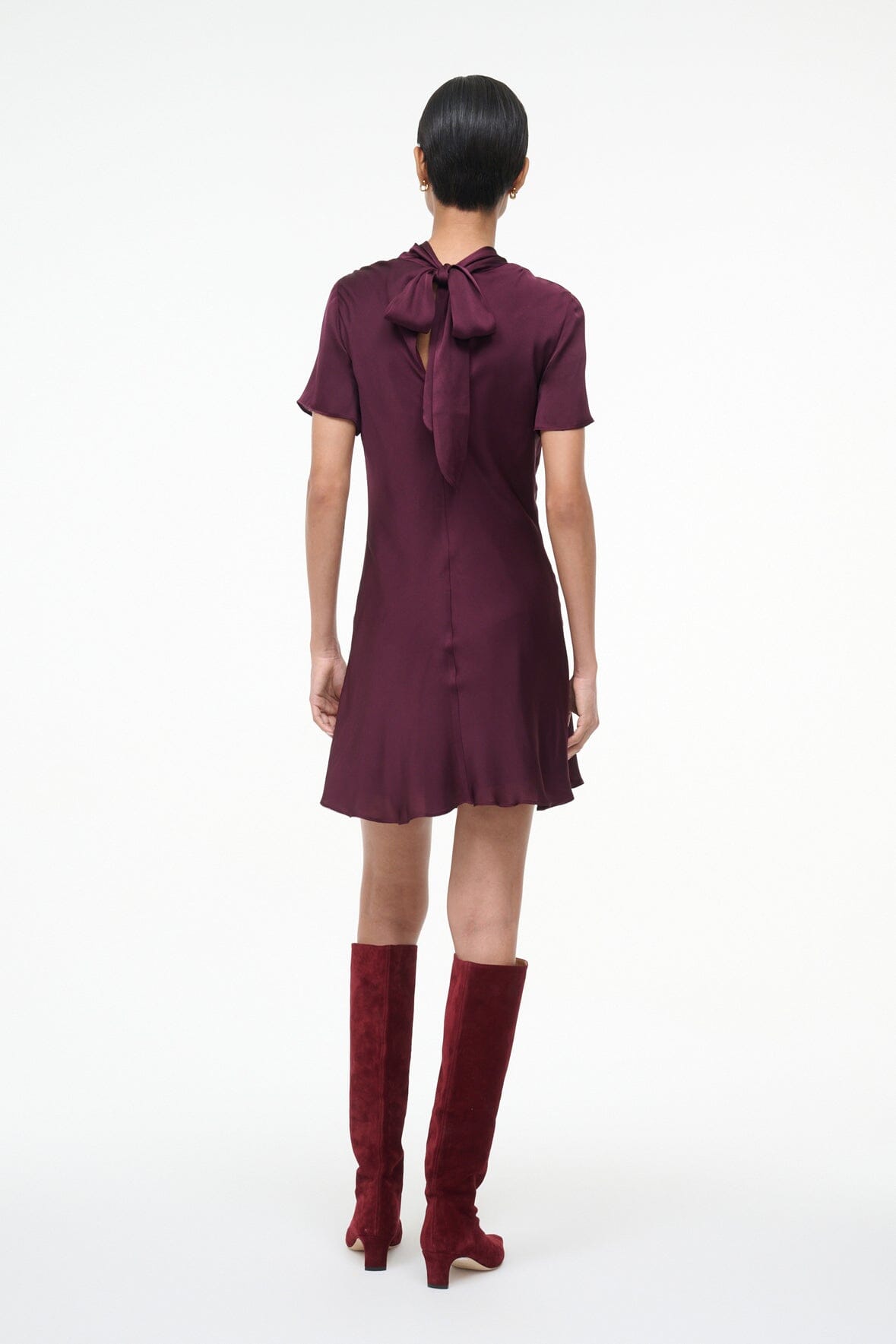 The Iris is a new silk mini dress perfect to dress up or down – this style features a cowl neck, short flutter sleeves, and a tie at the back.