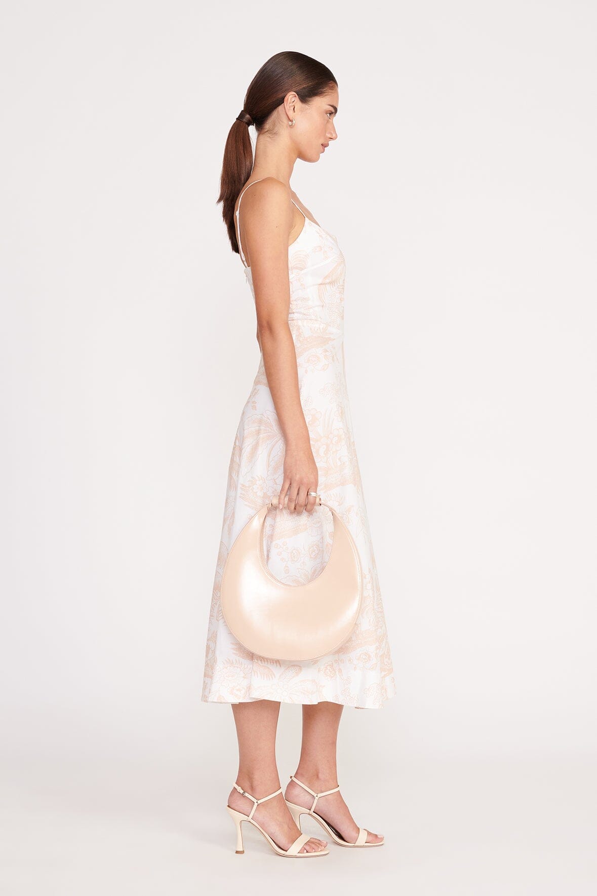 The Moon Bag is updated in a new polished leather for Resort and features a curved handle with a removable STAUD embossed accent. Designed in a crescent moon shape with inner suede lining and a magnetic clasp closure to hold your essentials.