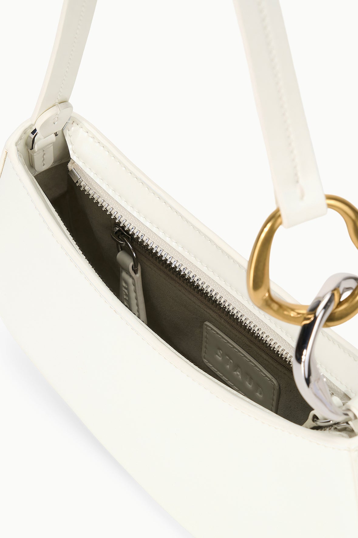 The Ollie Bag is a mini shoulder bag made out of polished leather. This style features a hardware design on the strap and a zip closure.