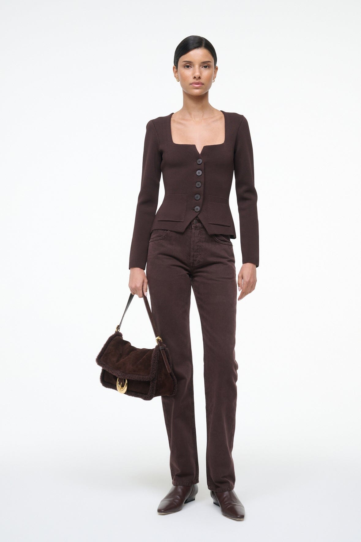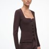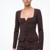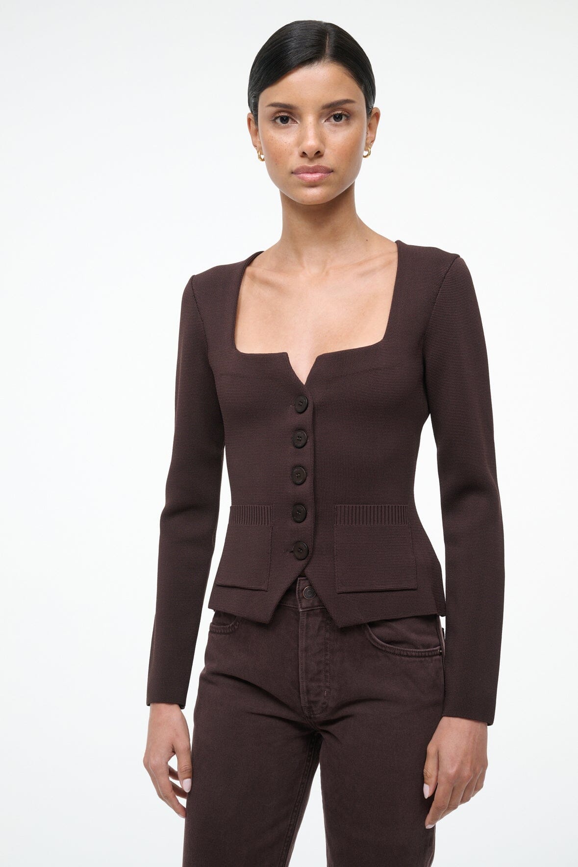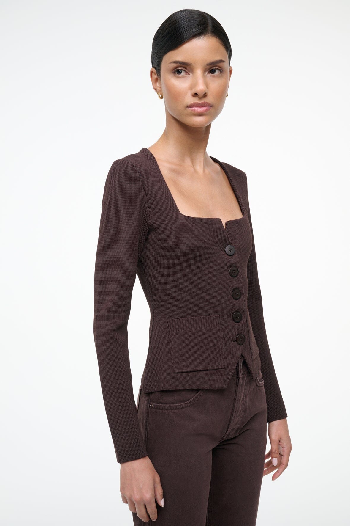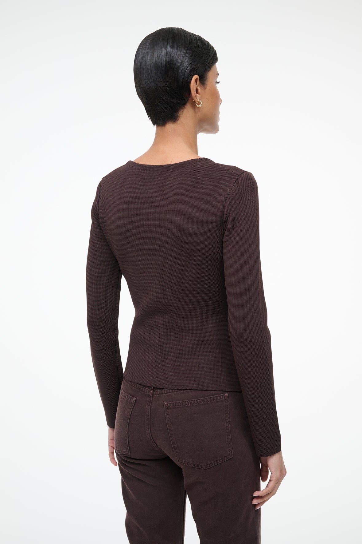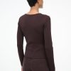 The Rachela Top is a compact knit top with long sleeves, and a cutaway detail at the top and bottom. This style features a button front and patch pockets at the waist.