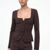 The Rachela Top is a compact knit top with long sleeves, and a cutaway detail at the top and bottom. This style features a button front and patch pockets at the waist.