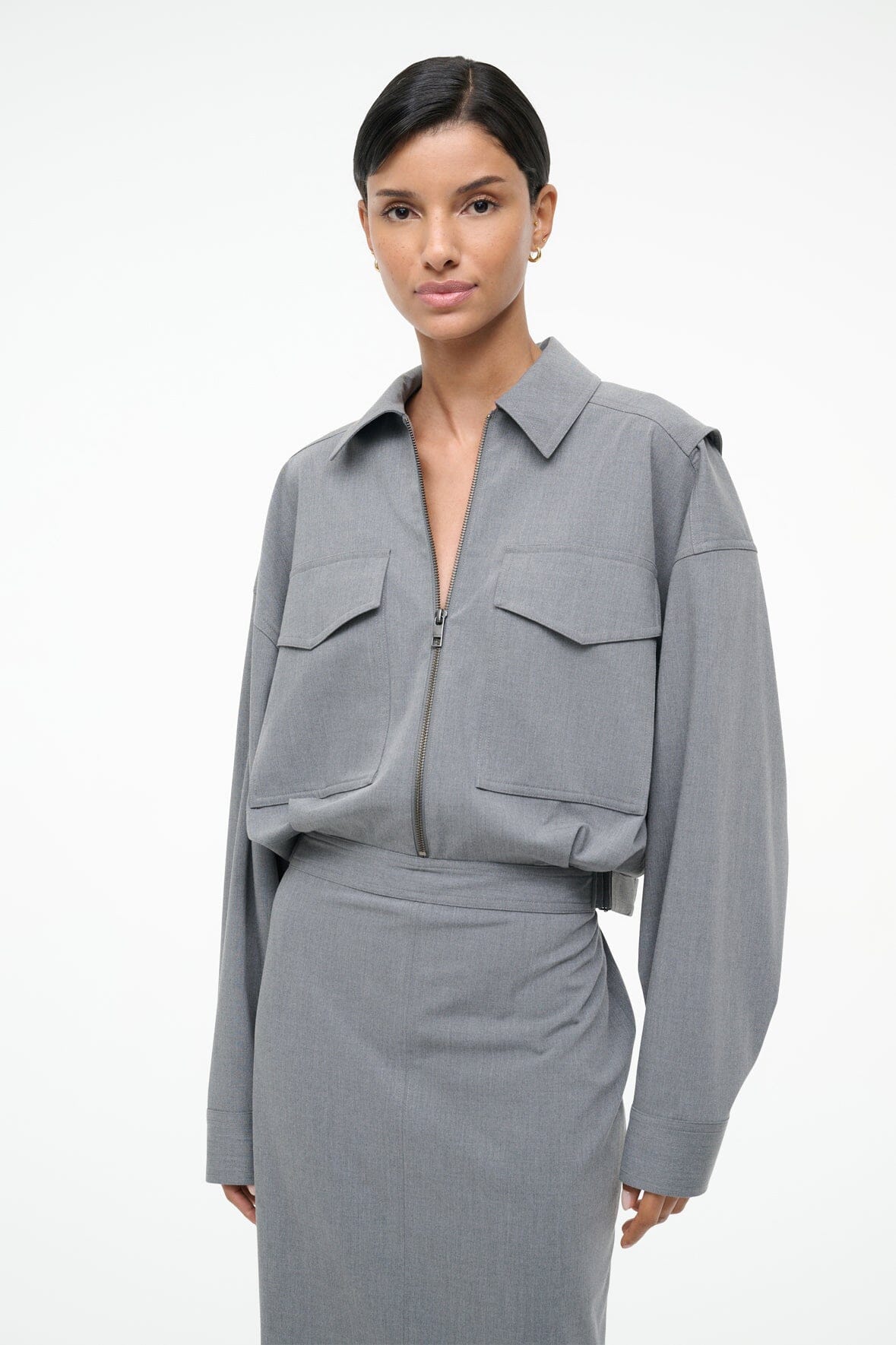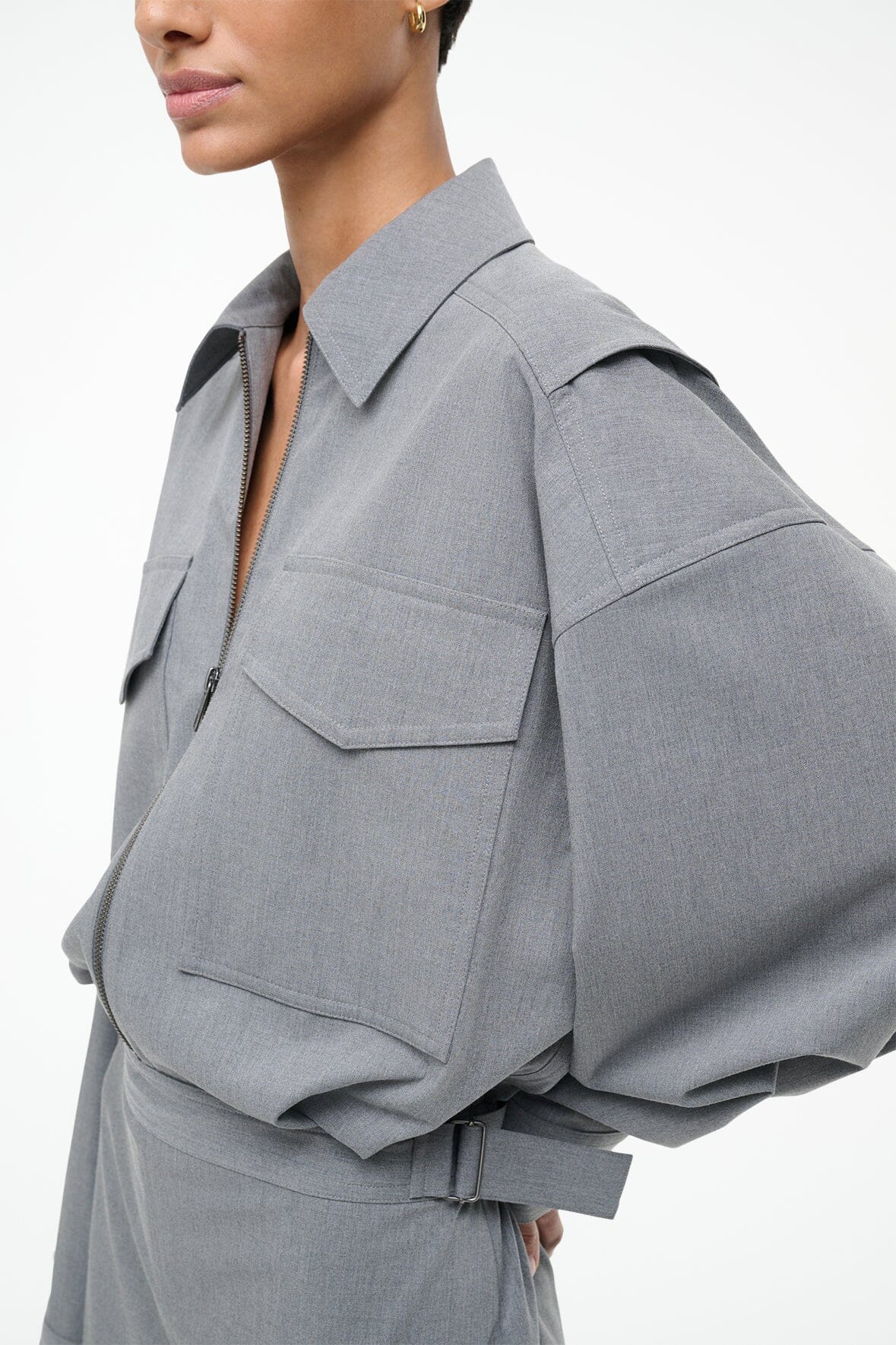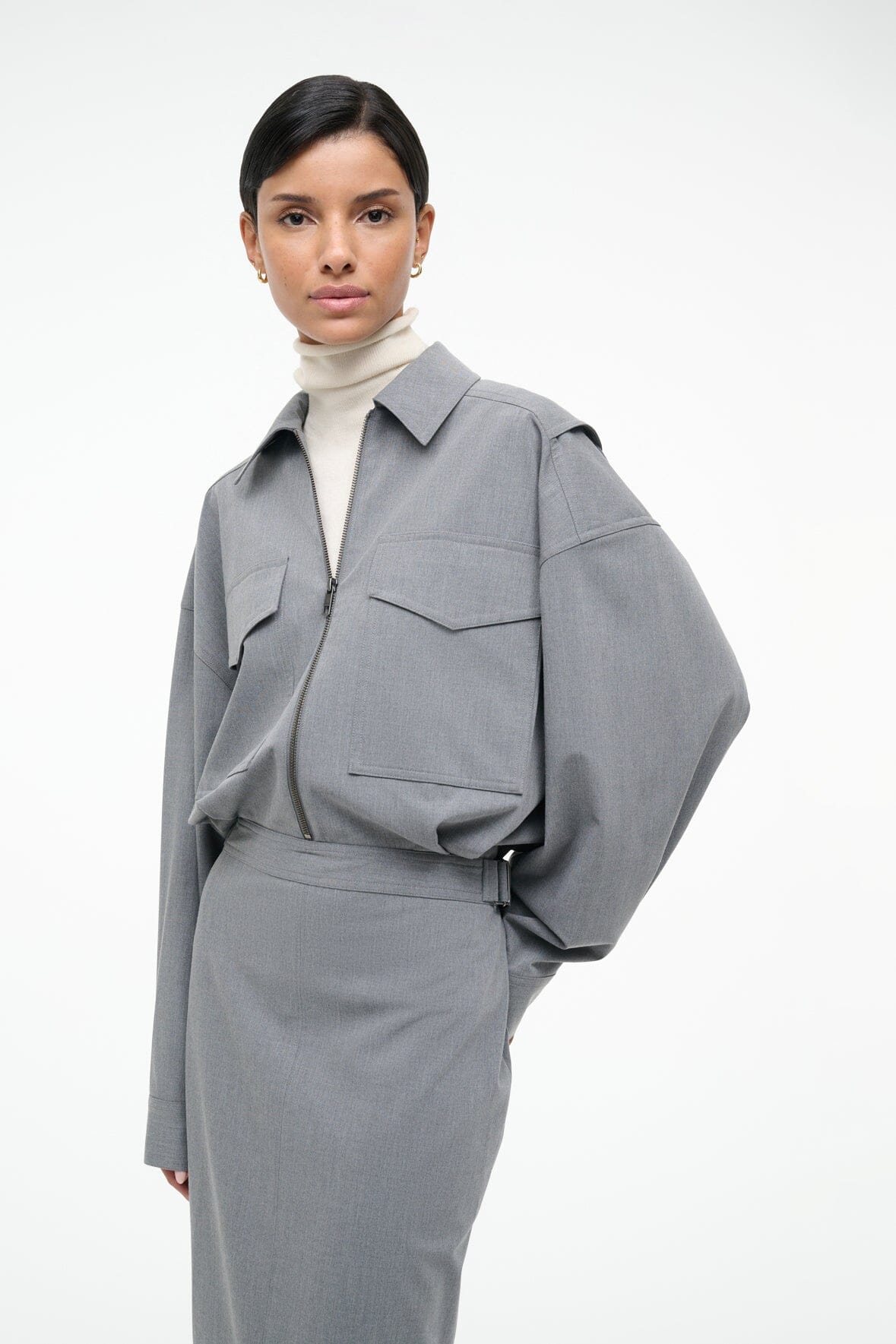 The Scout Dress is a structured zip-front dress with utility pockets and a sleek column skirt.