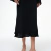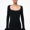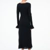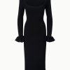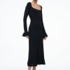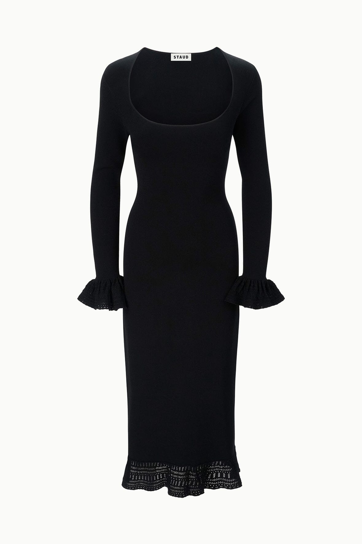 The Shelley Dress is a fitted knit midi dress with a flared crochet hem and flared crochet cuffs. This style has a square neckline and is fitted through the body.