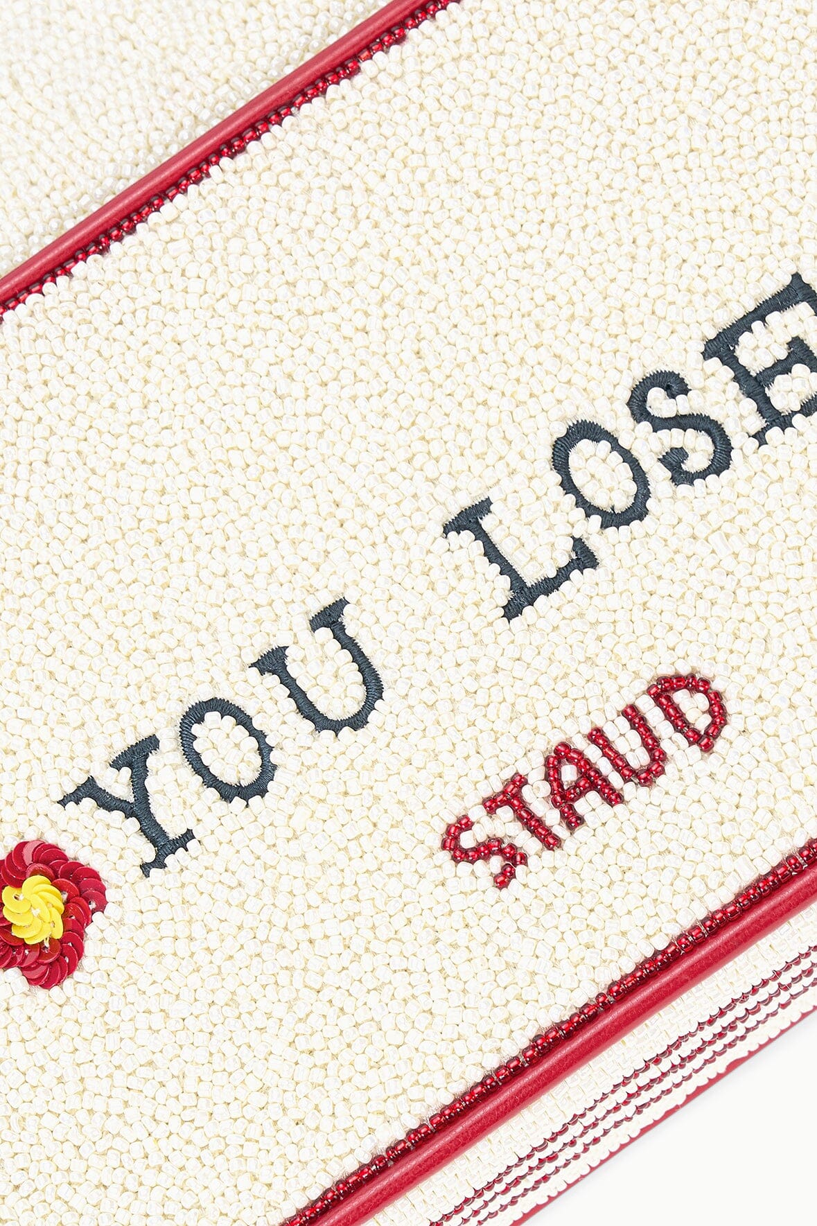 Our latest limited-edition Tommy features a playful seasonal print. The Tommy Bag is a hand-beaded shoulder bag with vegan leather piping. This style features a single flap closure, inner zip, and a back slip pocket.