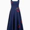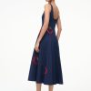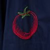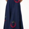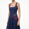The Wells Dress has a square neckline and features a corset-inspired paneled bodice to create a flattering, fitted shape through the waist. It is made out of a lightweight cotton poplin and has a center back zipper. The Navy Roma Wells Dress has been updated with embroidery throughout the bodice and skirt in our seasonal tomato motif.