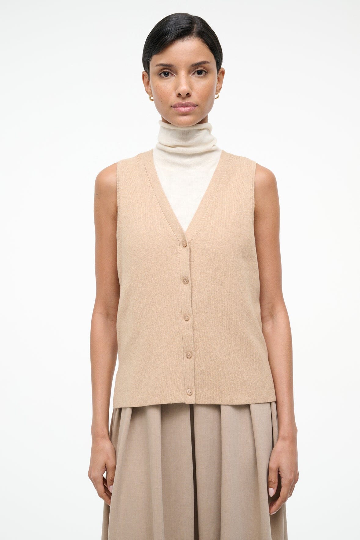 The perfect transitional dress, this pre-styled cotton and cashmere piece offers a pre-styled woven skirt and fully fashioned sleeveless knit vest.