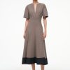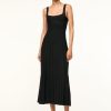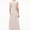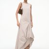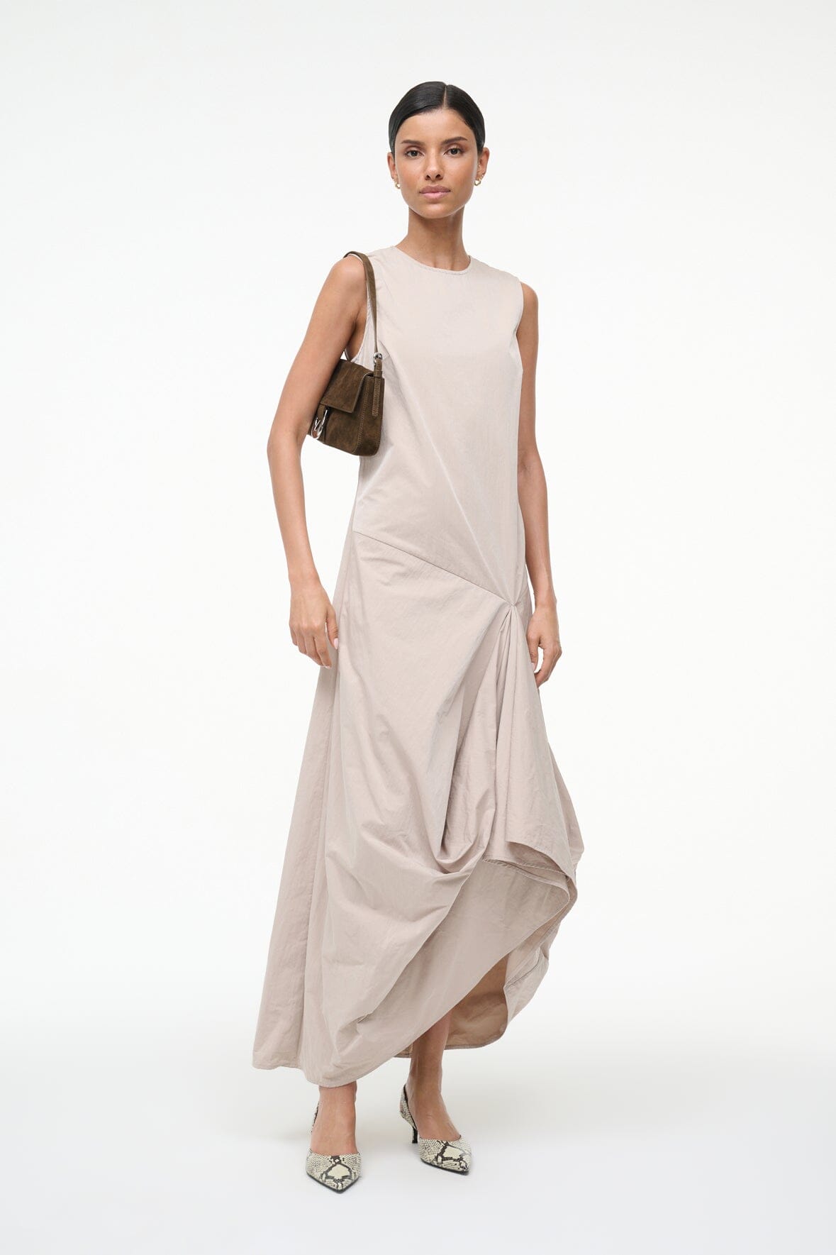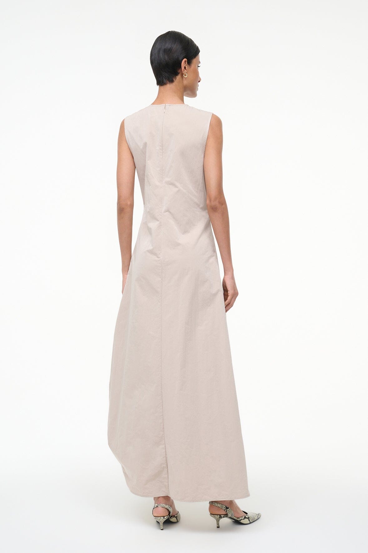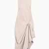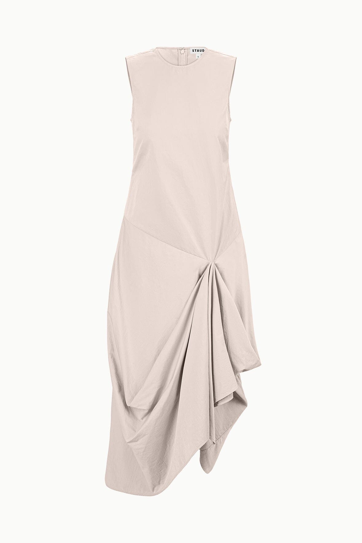 A sleeveless dress in cotton nylon, the Viola Dress features a draped skirt which creates a dramatic asymmetrical hem.