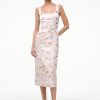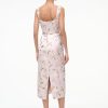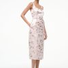The Zoe Dress is a new floral brocade midi dress, featuring a fitted square neckline, a tie detail at the waist, and a tulip-shaped skirt.